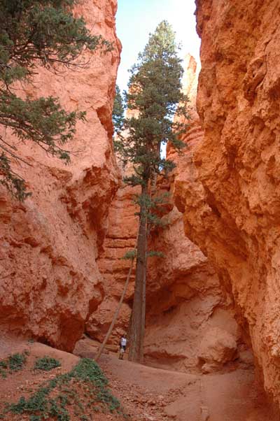 We continue past Queen’s Garden, past the cutoff for the Navajo Loop trail, and turn back toward the rim through the narrow confines of Wall Street. Hikers on this trail benefit from a fair bit of rock-cutting, shoring up and stair-building, much of the work was done not by the National Park Service, but by the the Civilian Conservation Corps. We have a sentimental attachment to the CCC’s, Jan’s dad (“Roz”) was part of the Corps before WWII, and there’s an old CCC camp on Mud Creek Road that we pass on the way to our Lake Vermilion cabin.