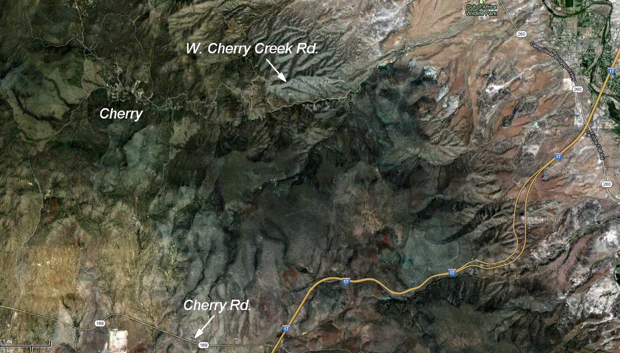 I call James to let him know when we’re arriving, and he suggests an alternate and more scenic route from Highway 17 to Prescott than the normal one. However, as the saying goes, “What we have here is a failure to communicate”. James thinks he’s sending us on Cherry Road, but I think he’s telling us to drive through the town of Cherry, and we end up on W. Cherry Creek Rd. instead. I should have known something was wrong when the map on Jan’s smart phone showed the town all right, but showed no road leading to or from it. Here’s a satellite view of the route we end up taking: