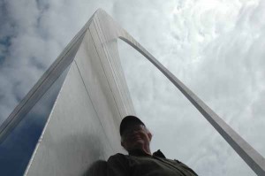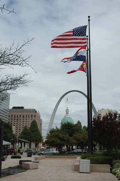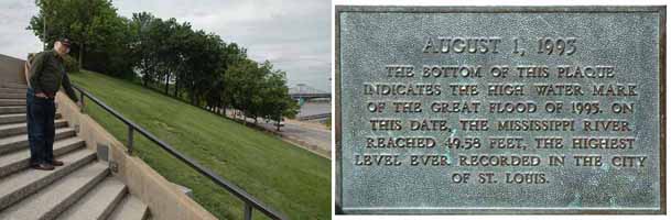 George loves this new public space and the Arch itself, and is an enthusiastic tour guide. He led us straight to one corner of the North base, a spot from which the Arch seems to sit completely crosswise. He also pointed out to us the plaque on the stairs leading down to the river, which indicates the high water mark of the Great Flood of 1993. You can see the riverfront sidewalk down on the right, considerably higher than the current level of the river, which is nevertheless still causing serious flooding downstream of St. Louis.