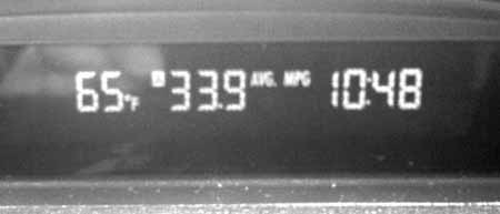 We’ve left Evergreen Park and gotten on the road to LakeVermilion, but it’s a ten-hour drive and we decided to break it and spend the night in Duluth. One of the Subaru’s cool features is that it continuously reports cumulative gas mileage since the last time you reset one of the trip meters. They promised us only 27 mpg on the highway (it’s 4-wheel drive, after all), but we’ve been getting well over 30 actual mpg on long stretches. At one point when we had been slowed for a while to around 50 mph for construction, the gas mileage displayed on the dash was…well, have a look: